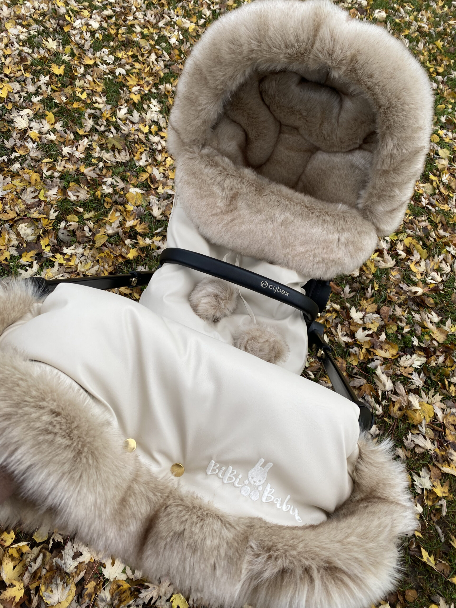 The winter set for the stroller is universal, it is suitable for most strollers (excluding strollers that have two separate handles – in this case, please contact us by email or phone). The set includes a universal sleeping bag measuring approximately 115 cm long by 48 cm wide, a universal muff and a fur collar approximately 110 cm long (if necessary, we will sew a longer collar if the circumference of the booth is larger) – the set does not include the booth.