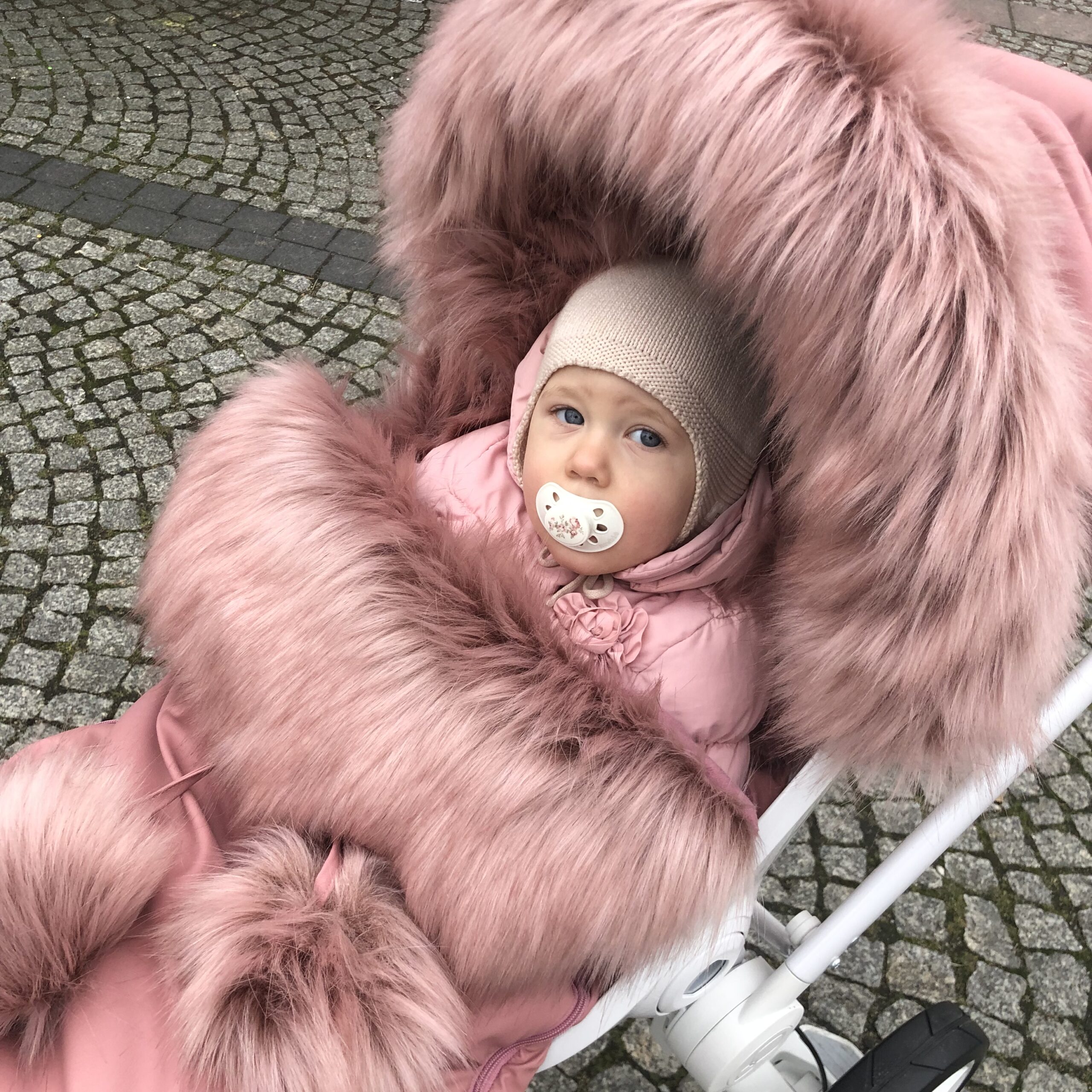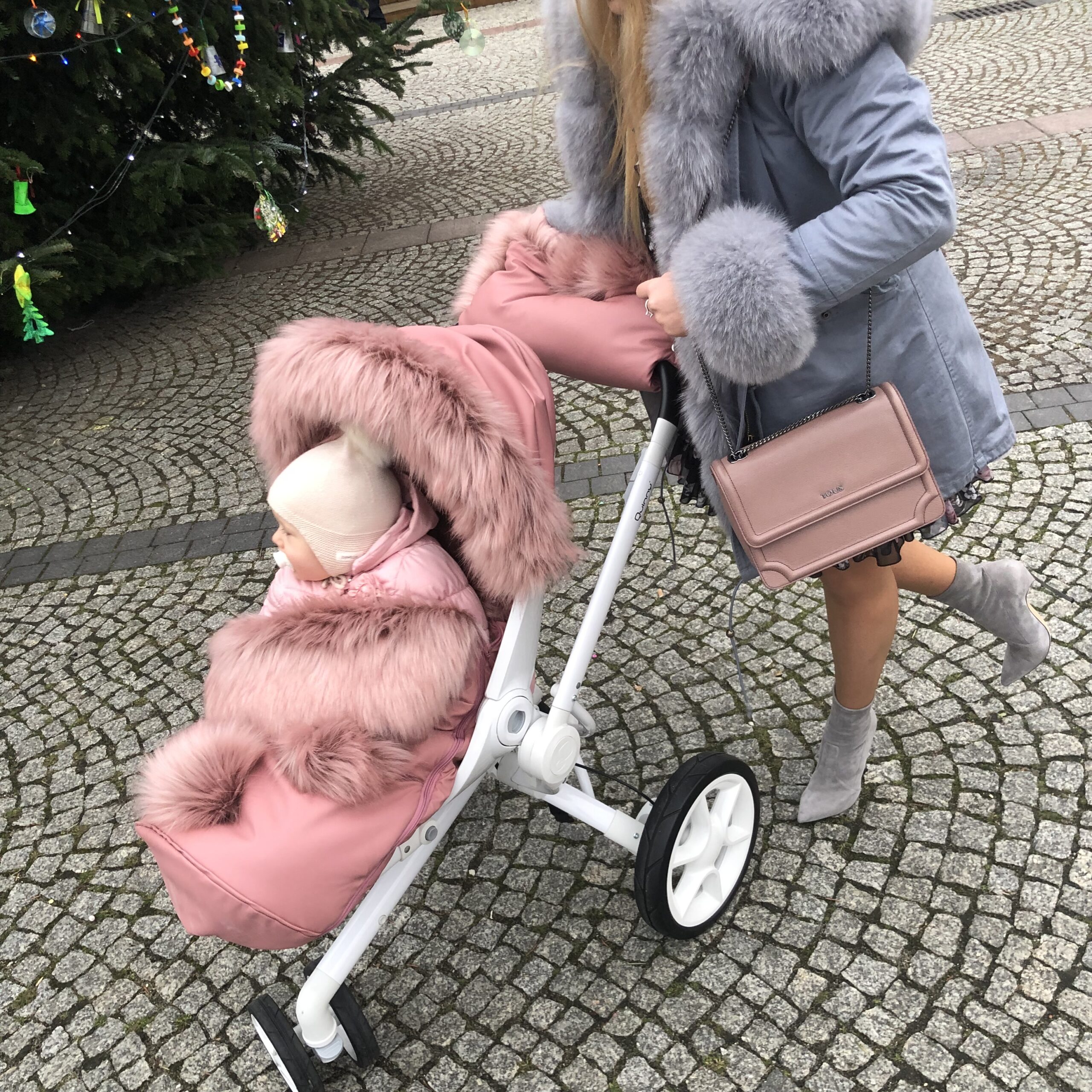 The winter set for the stroller is universal, it is suitable for most strollers (excluding strollers that have two separate handles – in this case, please contact us by email or phone). The set includes a universal sleeping bag measuring approximately 115 cm long by 48 cm wide, a universal muff and a fur collar approximately 110 cm long (if necessary, we will sew a longer collar if the circumference of the booth is larger) – the set does not include the booth.