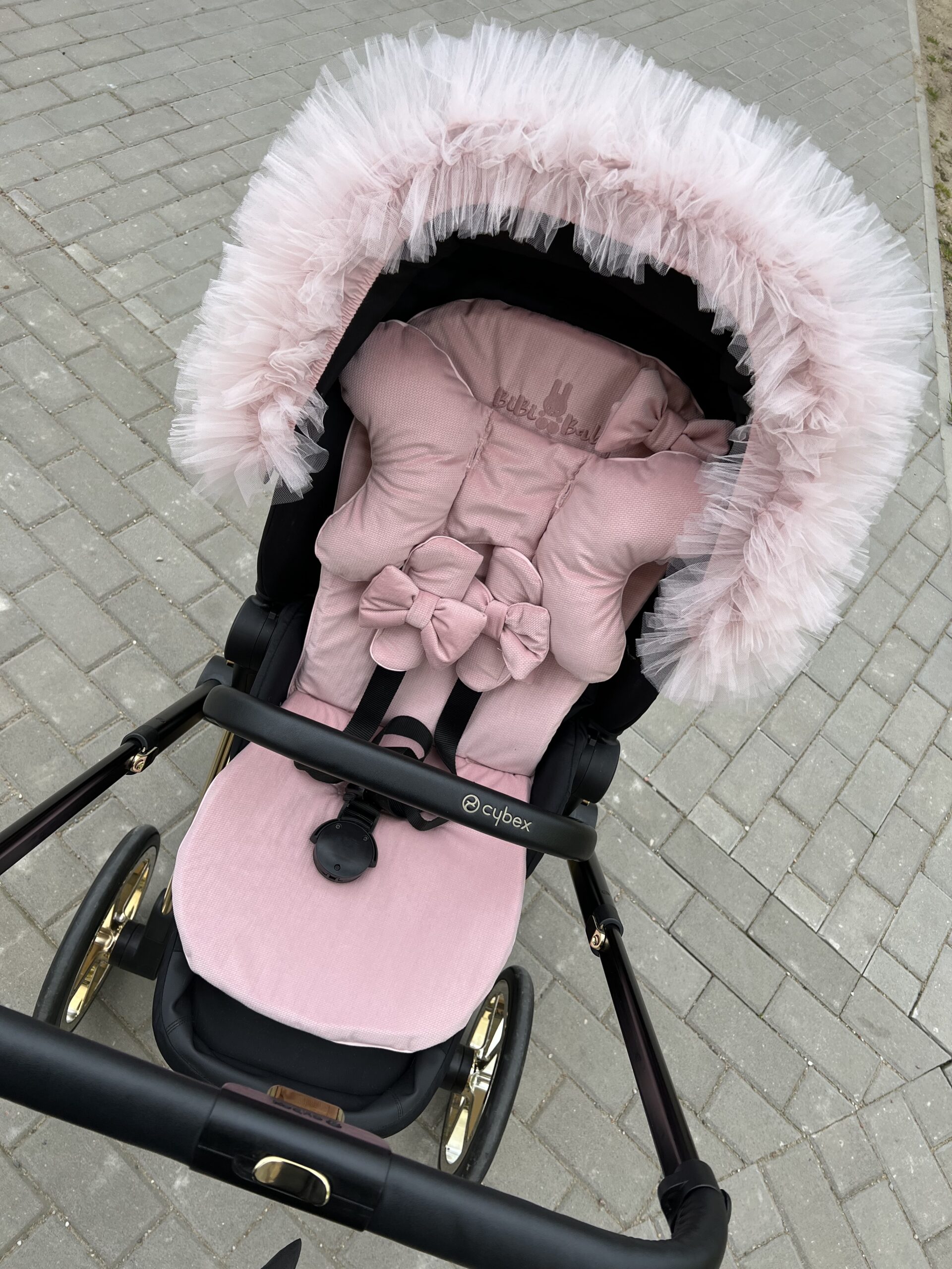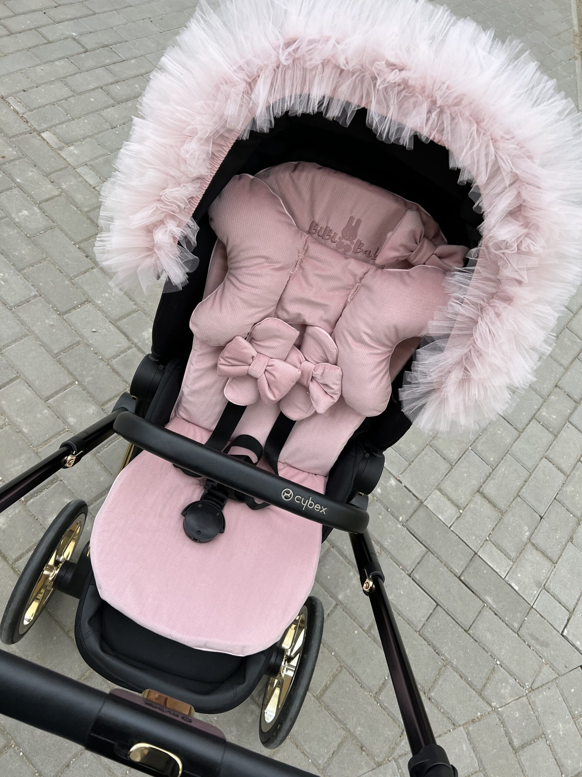 - Wkładka do wózka – uniwersalna – jedna strona piękny milutki velvet- z drugiej strony bawełna 100 %- wkładka posiada otwory na pasy, – wykończenie ozdobną złotą lamówką, która nadaje niezwykłej elegancji i szyku,